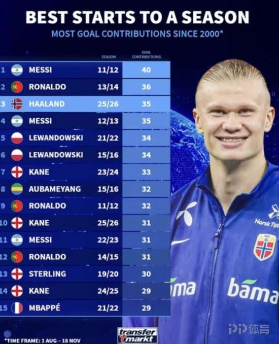 德转统计了本世纪球员赛季初各项赛事参与进球榜,该榜单统计时间段为各赛季的8月1日至11月18日。