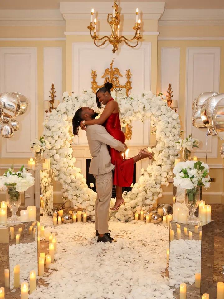 巴克利随后发布订婚现场照片,并写道:“永远这个词在戴上戒指后更美好了。《雅歌》3:4(意为他带我入筵宴所,为我矗起爱的杆旗),我找到了我心所爱的那一个。”两人已相恋多年,而塞门约选择在两人交往五周年当天求婚。