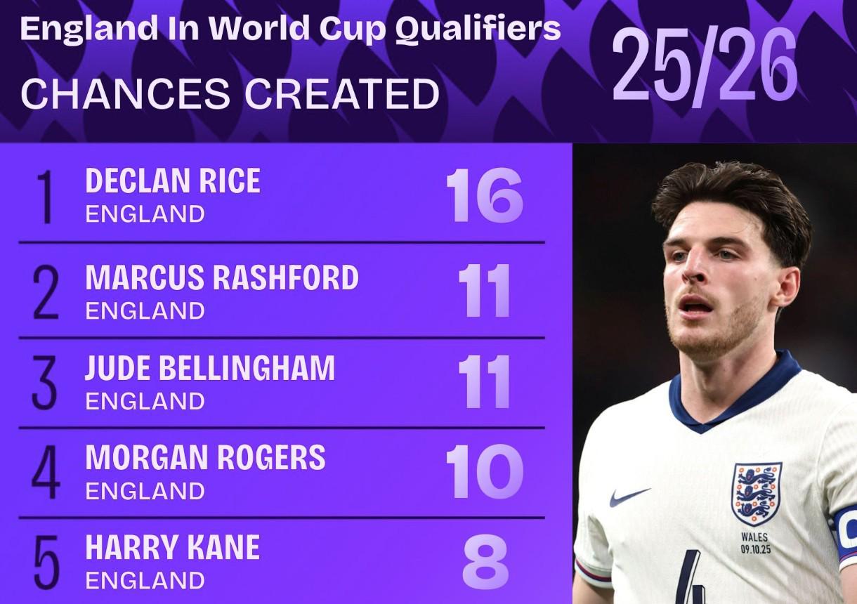 北京时间11月17日,来自知名数据机构Squawka的统计指出,在2026年世界杯预选赛期间,赖斯是英格兰队内创造机会次数最多的球员。